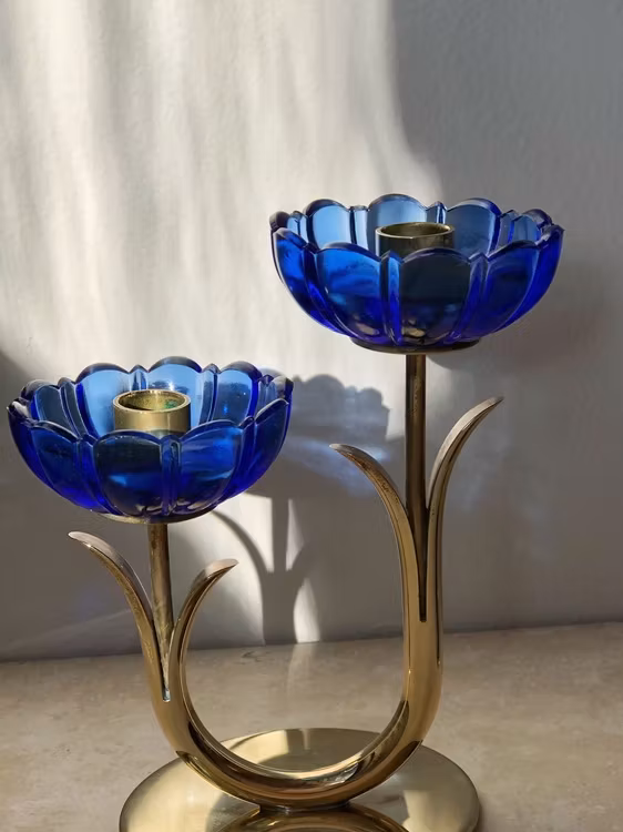 Gunnar Ander set of two Candle Holders by Ystad Metall, blue flower with brass