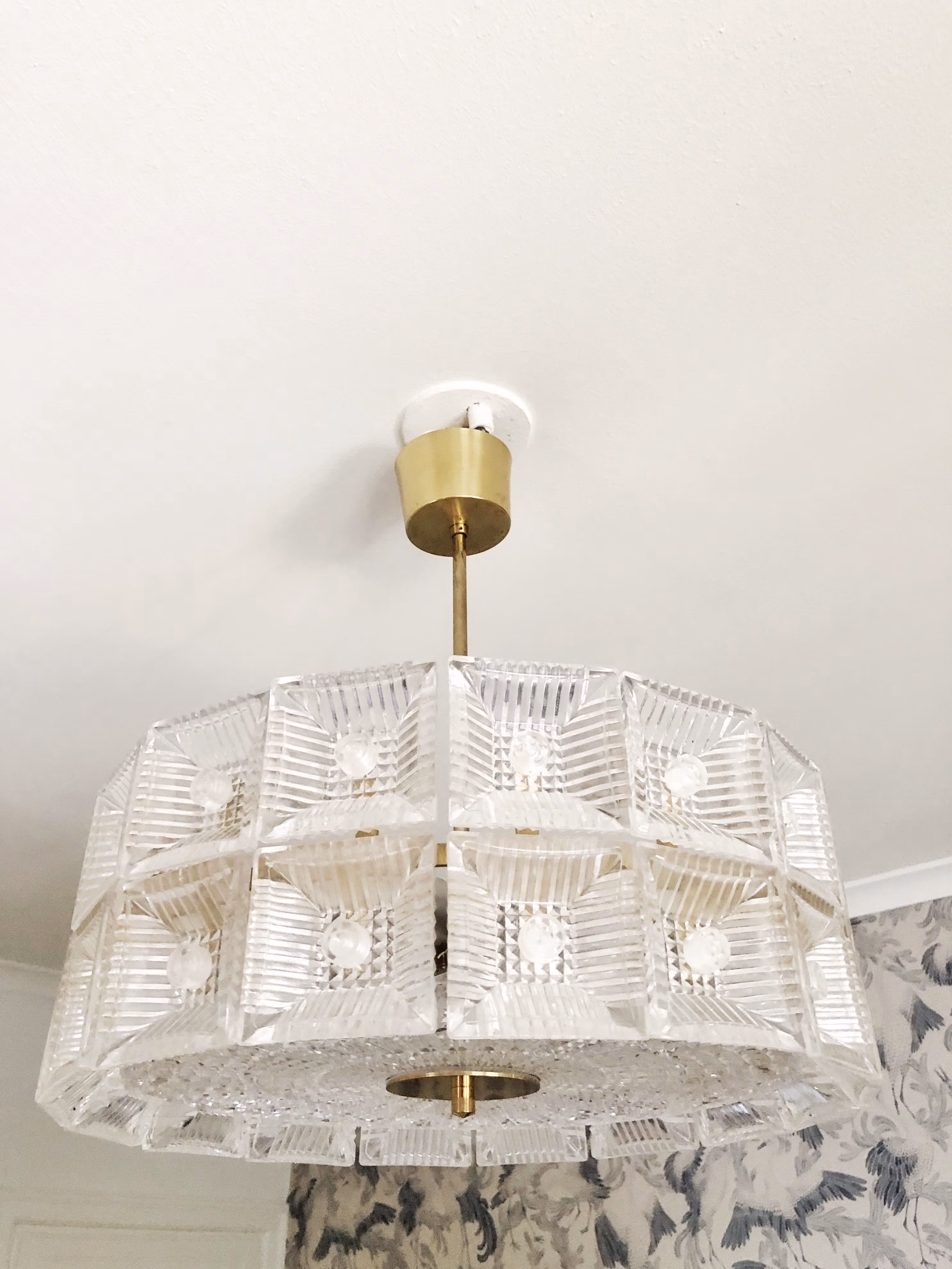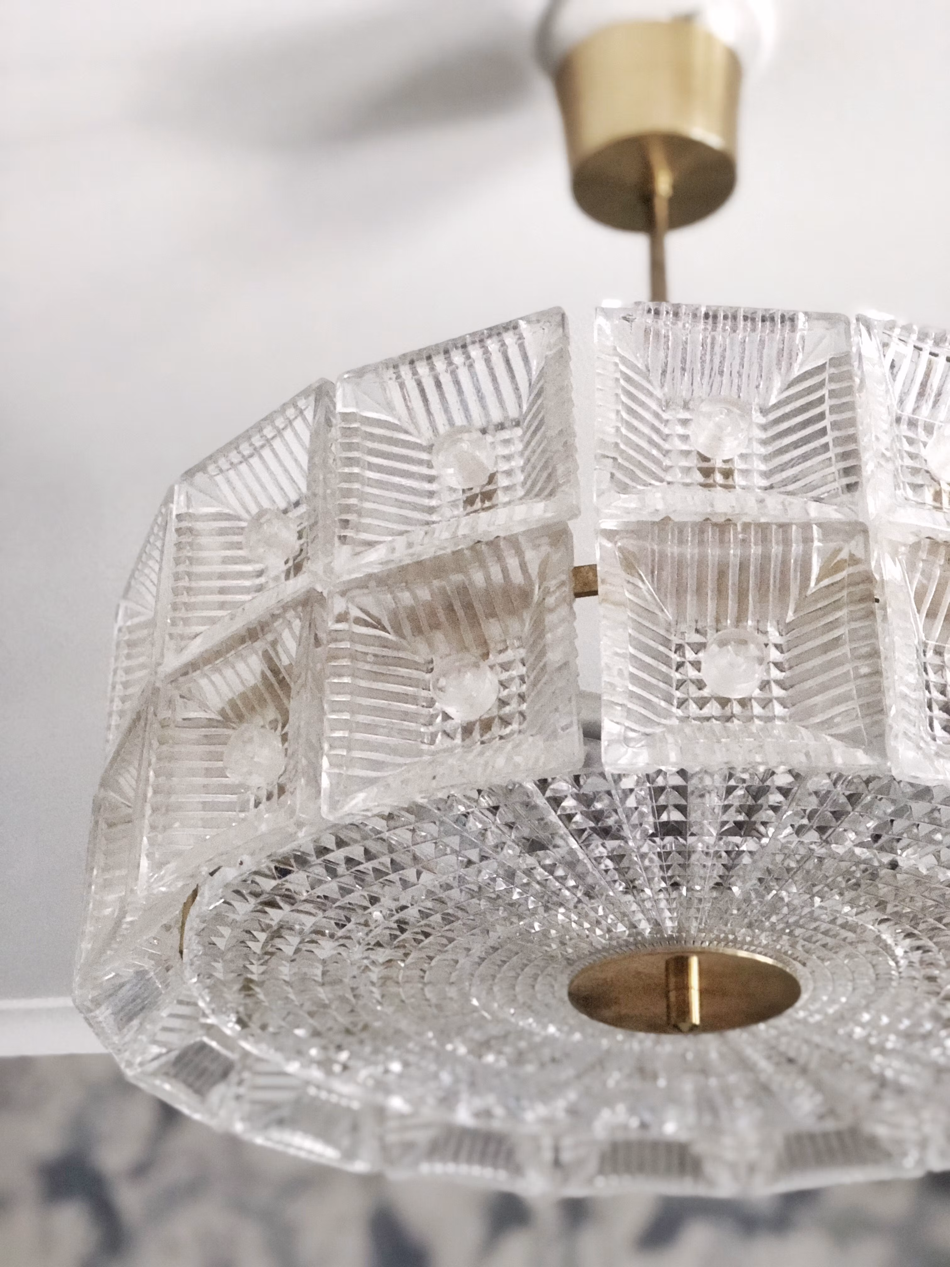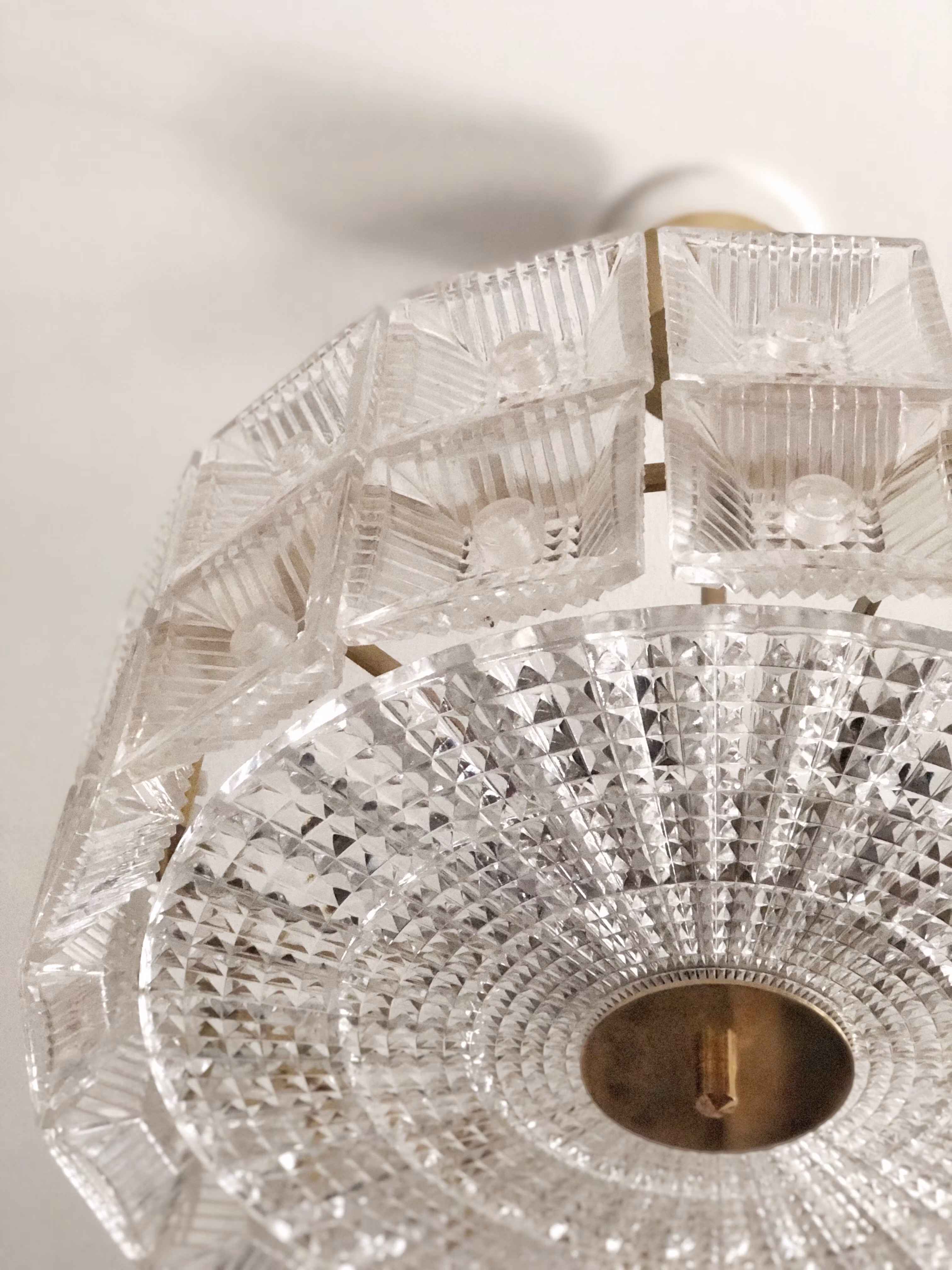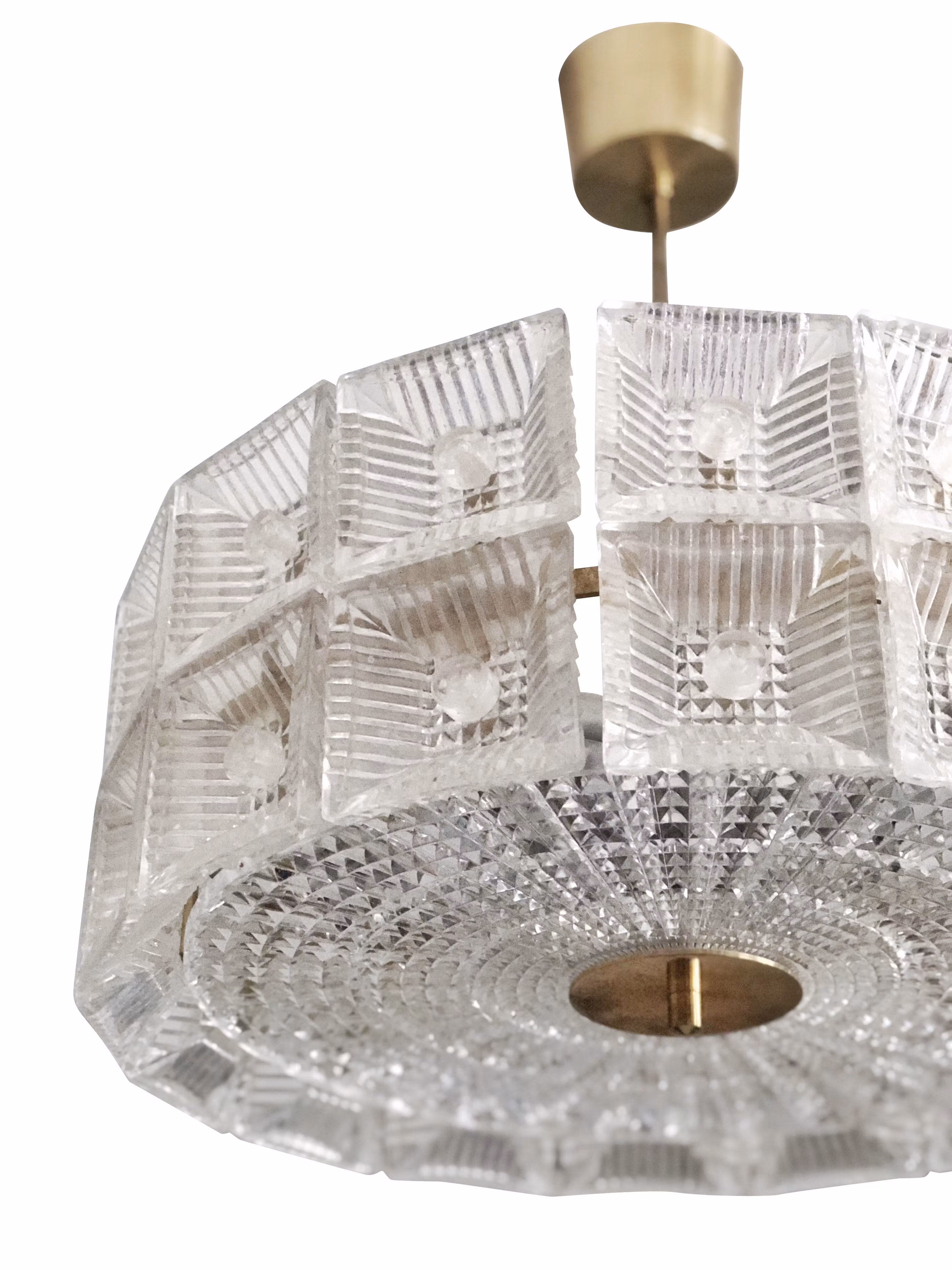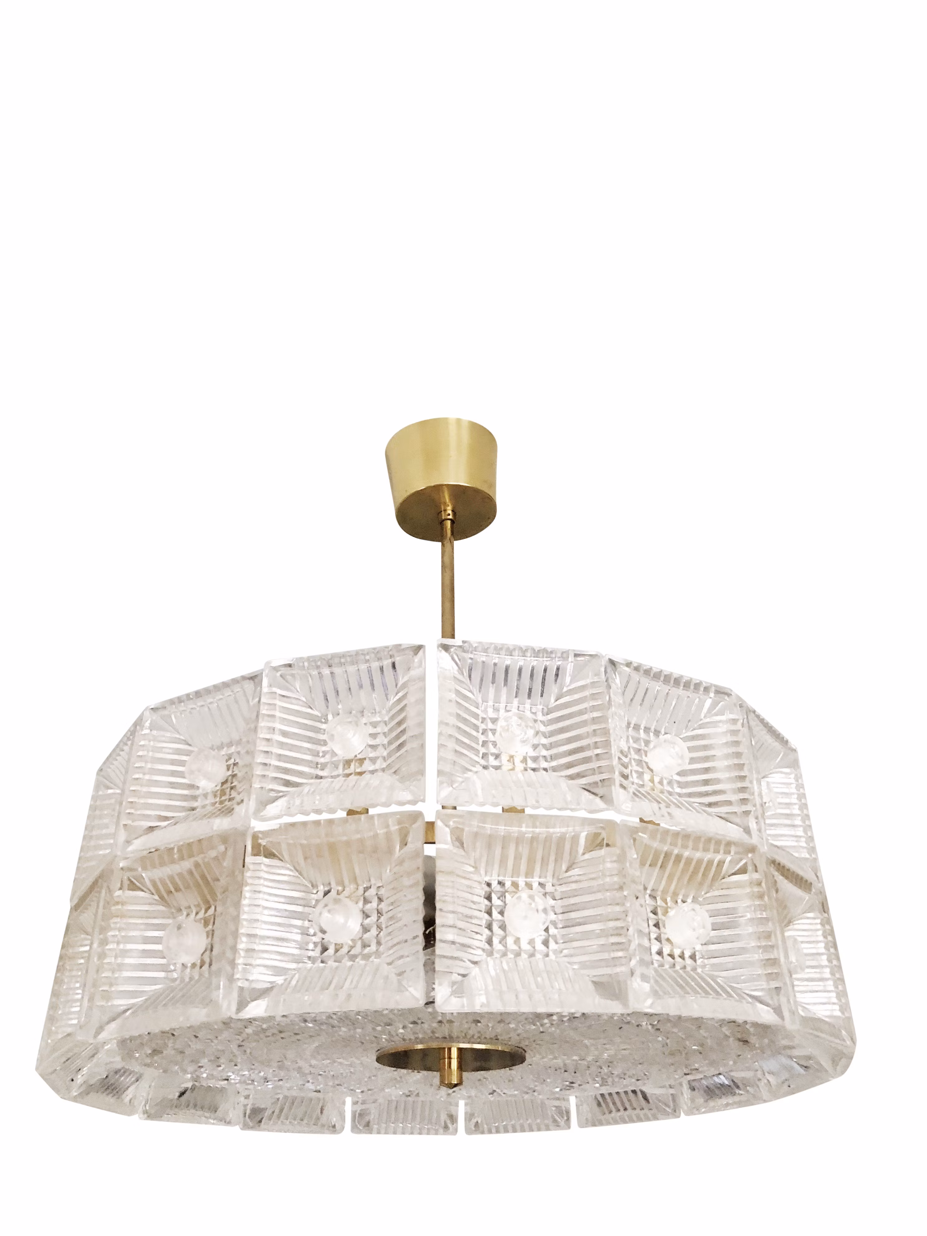 Orrefors 60's chandelier composed of two rows of square crystal elements suspended on a brass frame stem and canopy. Designed by Carl Fagerlund for the Swedish Glass maker Orrefors.