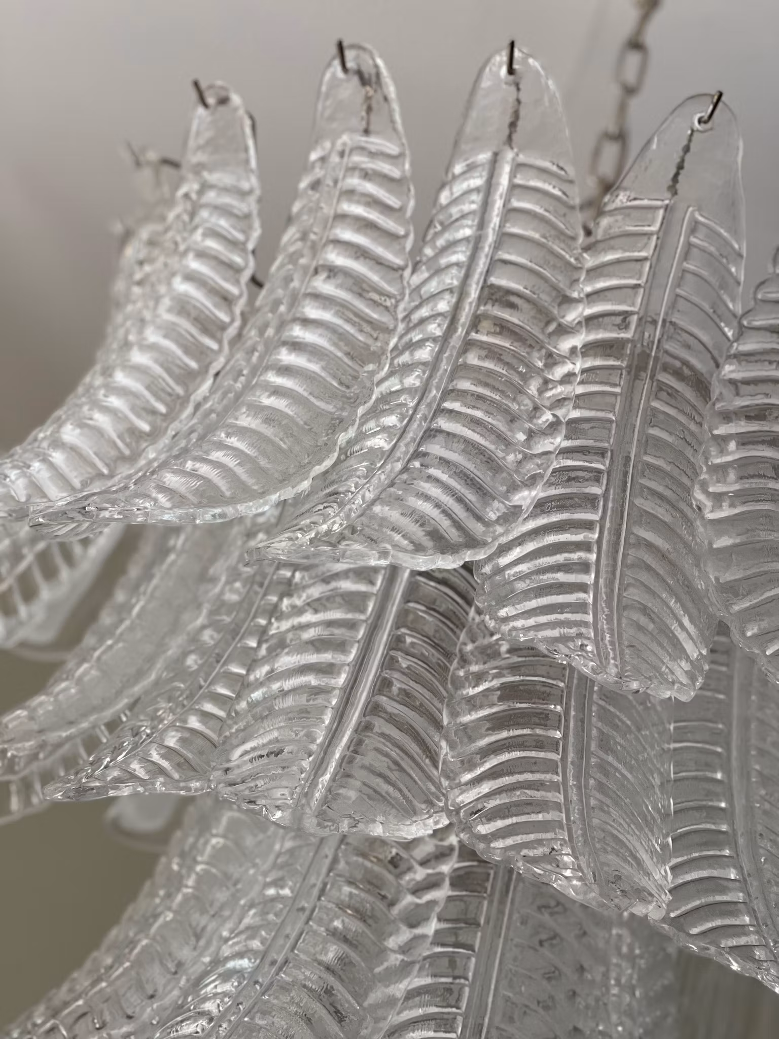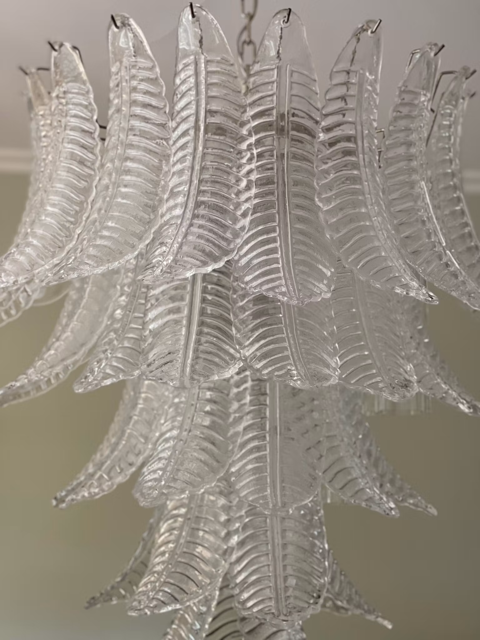 Large Contemporary Murano Chandelier. Chandelier in Traditional Italian Mid-Century Style and produced during the 21th Century. The chandelier is composed of 52 transparent feather formed crystal prisms in the size of 33 x 11 cm.