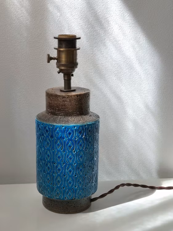 Italian Modern Bitossi handmade Table Lamp in brown and turquoise stoneware. 60's. Textured surface with beautiful ornaments. Signed under. New wiring, let us know if you want American or European plug.
